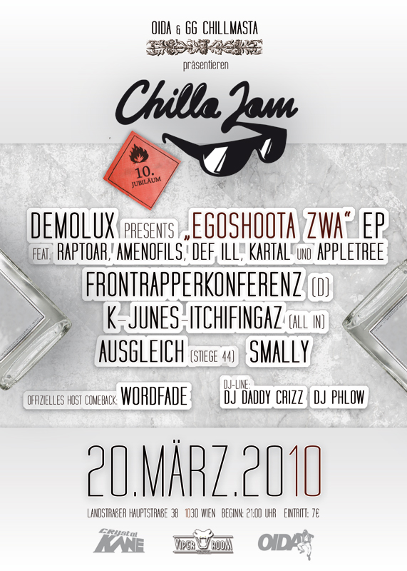 Zwischen April und Oktober 2010 erschien zudem der „Chilla Jam – Sampler Vol. 1“ (März Records), der in der letzten The Message-Print-Ausgabe (No. 41, Marianne Mendt am Cover) von Jan Braula als „schlussendlich doch leiwande Scheibn“ rezensiert wurde. Einige Mitwirkende des Samplers sind auch heute noch aktiv und mittlerweile zu Wiener Szenegrößen gereift – wie beispielsweise Kreiml & Samurai (noch mit der Wienzeile), Esref (noch mit Raptus) oder Kid Pex, um nur einige zu nennen. Mit dem Sampler ging es dann auch auf Tour durch Österreich.