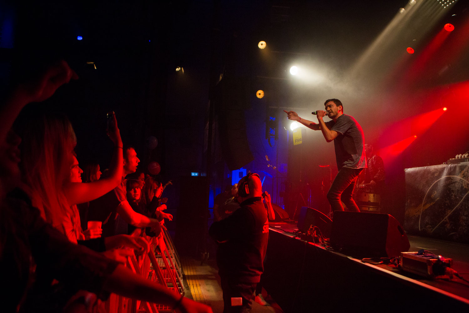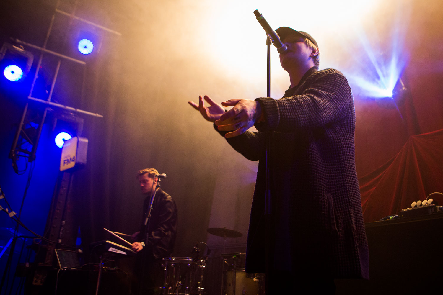 Nach kurzem Umbau und regem Hin und Her unter den Besuchern betritt Gerards Band inklusive Bitten By die ansehnliche Bühne. Gerard nimmt uns mit auf eine Reise durch den jüngeren Teil seiner Diskografie – wobei Tracks wie „Lissabon“ und „Atme die Stadt“ nicht fehlen dürfen. Letzterer sieht sogar ein Feature von OK KID vor, die vergangenes Jahr den FM4-Geburtstag mitfeierten. Dieses Jahr bleibt es bei einer Solo-Performance vonseiten Gerards. Auch die erste Single zum kommenden „AAA“-Album, das über sein selbstgegründetes Label Futuresfuture erscheinen wird, darf nicht fehlen – „Luftlöcher“ befindet sich passenderweise diese Woche auf Platz 7 der FM4-Charts. Der herzliche Oberösterreicher rappt und singt sich in die Herzen der Umstehenden, auch wenn seine Worte immer wieder in der Weite der Halle verhallen. Nicht die perfekten Konditionen für Sprechgesang – doch wenn nicht die Band und die elektrische Stimmung auf der Bühne die Unreinheiten ausgleichen, dann die vollgestopfte Halle, die herzhaft mitsingt. Quasi ein richtiges Heimspiel für Gerard.