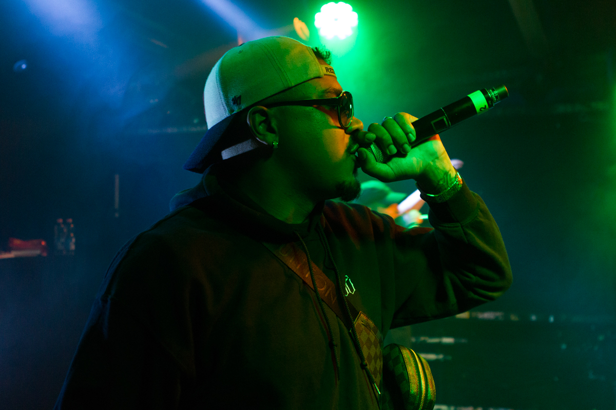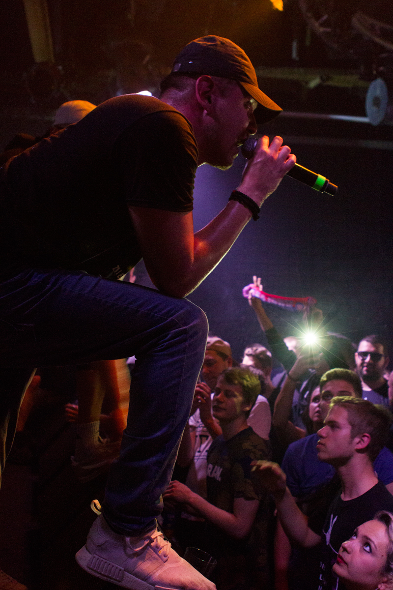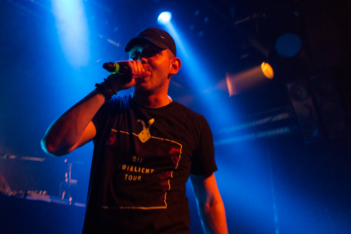 Nach einer kurzen Verschnauf- und Raucherpause geht es um 21:15 mit dem Mainact weiter. Haze startet die Show mit dem thematisch passenden Track „Es geht los„, das Publikum zeigt sich begeistert und möchte ebenfalls im Gedächtnis des Künstlers bleiben. Neben Liedern aus dem neuen Album, der „Zwielicht LP“, werden auch alte Stücke aus den älteren Werken „Guten Abend Hip-Hop“ und „Wie der Hase läuft EP“ angespielt. Backuprapper Eazyono unterstützt Haze lautstark beim Beenden der Sätze und bleibt dank starker Performance in den Featureparts von „Kletter nicht durchs Fenster rein“ und „Aktiv“ im Gedächtnis des Zuhörers. Nach „Neuner“ richtet sich Haze an das Publikum: „Ich bin das erste Mal pünktlich auf der gesamten Tour in einer Stadt angekommen und habe mich erst einmal oberkörperfrei rausgesetzt und Joints geraucht“. Haze doing Haze-Things.