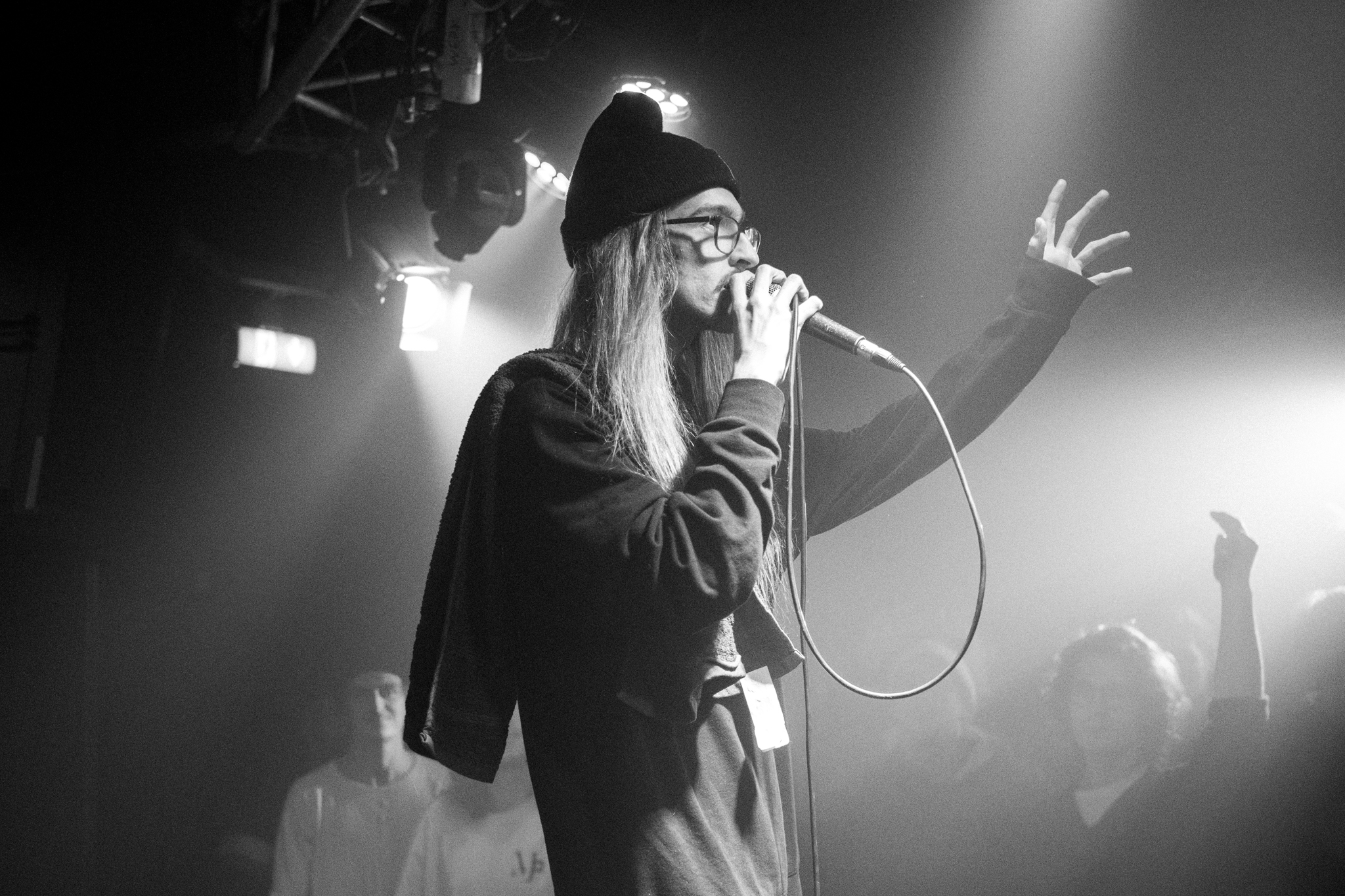 Mit Kamp-Zitaten und Querverweisen macht man sich in Wien generell schnell beliebt und so hat Johnny Rakete das Publikum von Anfang an auf seiner Seite. Es folgen einige Einblicke in die inzwischen umfangreiche Diskographie, die bis vor kurzem größtenteils aus EPs bestand. Erst bei den Tracks aus seinem aktuellen und ersten Album wird die Stimmung etwas gedrückt, was beim Albumtitel „Trauriger Junge mit Rauch in der Lunge“, Zeilen wie etwa „Seit Jahren schon, hab‘ ich mein‘ Todeswunsch erkannt, ich tauschte Ambitionen gegen Drogensucht und Angst“ auf „Wenn Katzen streiten“ und dem Motto der Tour „Kummer und Qualm“ die logische Konsequenz ist. Es gehört sehr viel Mut dazu, so offen über sein Innenleben zu sprechen, was das ganze Album schwer verdaulich und nicht gerade massentauglich macht. Aber erst vor wenigen Wochen hat Döll auf derselben Bühne bewiesen, dass Musik ein gutes Mittel ist, sich aus schwierigen Lebensphasen herauszukämpfen und negative Gefühle in etwas positives umzuwandeln.