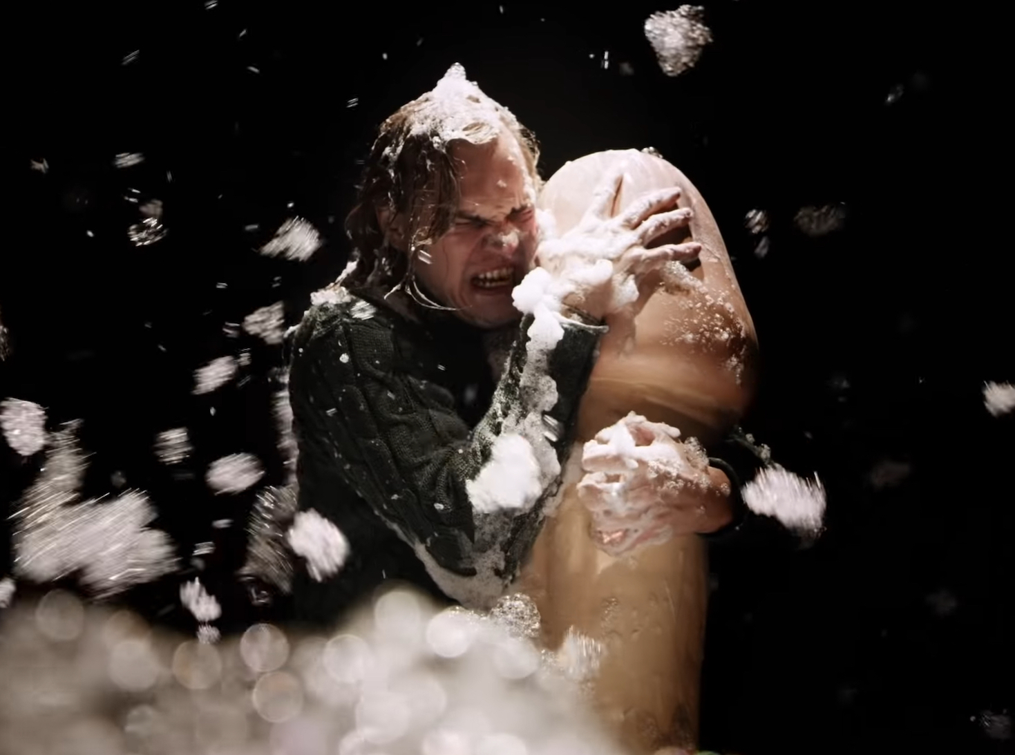 Mit einem leeren Blick macht der Sohn anfangs noch beim Tischgebet mit, die zweite Strophe gehört dann aber ihm: „Du wolltest ’nen Sohn, jetzt hast du mich / Eigentlich wolltest du nochmal dich, nur ohne Fehler, die du bereust / Jetzt hast du mich“. Nun ist die Stimmung gekippt, die Blicke wütend. Das Rotweinglas kippt um und was folgt, bewegt sich irgendwo zwischen Kunst und Banalität. Die Wut des Sohnes, die sich mit dem Essen und der damit einhergegangenen Diskussion angestaut hat, muss raus. Um die angezweifelte Männlichkeit unter Beweis zu stellen, fantasiert der Sohn davon, endlich auszubrechen. Schreiend bahnt er sich mit Gabel in der Hand den Weg aus der Tischdecke raus, plötzlich steht ein riesengroßer Penis mitten am Tisch – das Symbolbild für die vom Vater so sehr gewünschte Männlichkeit – und ejakuliert in gigantischen Maßen Schaum. Die aufschäumende Wut sozusagen.