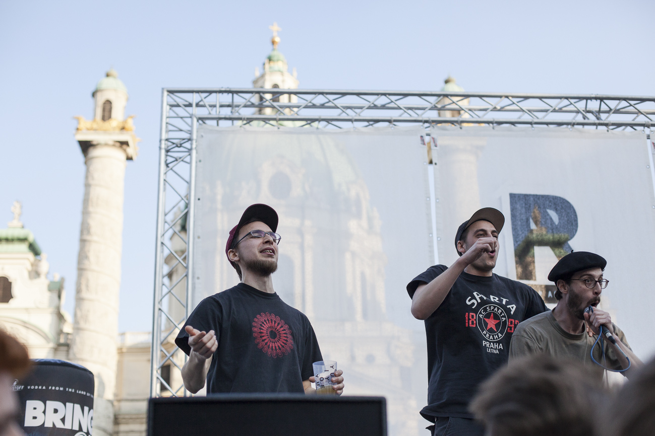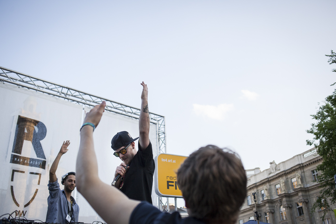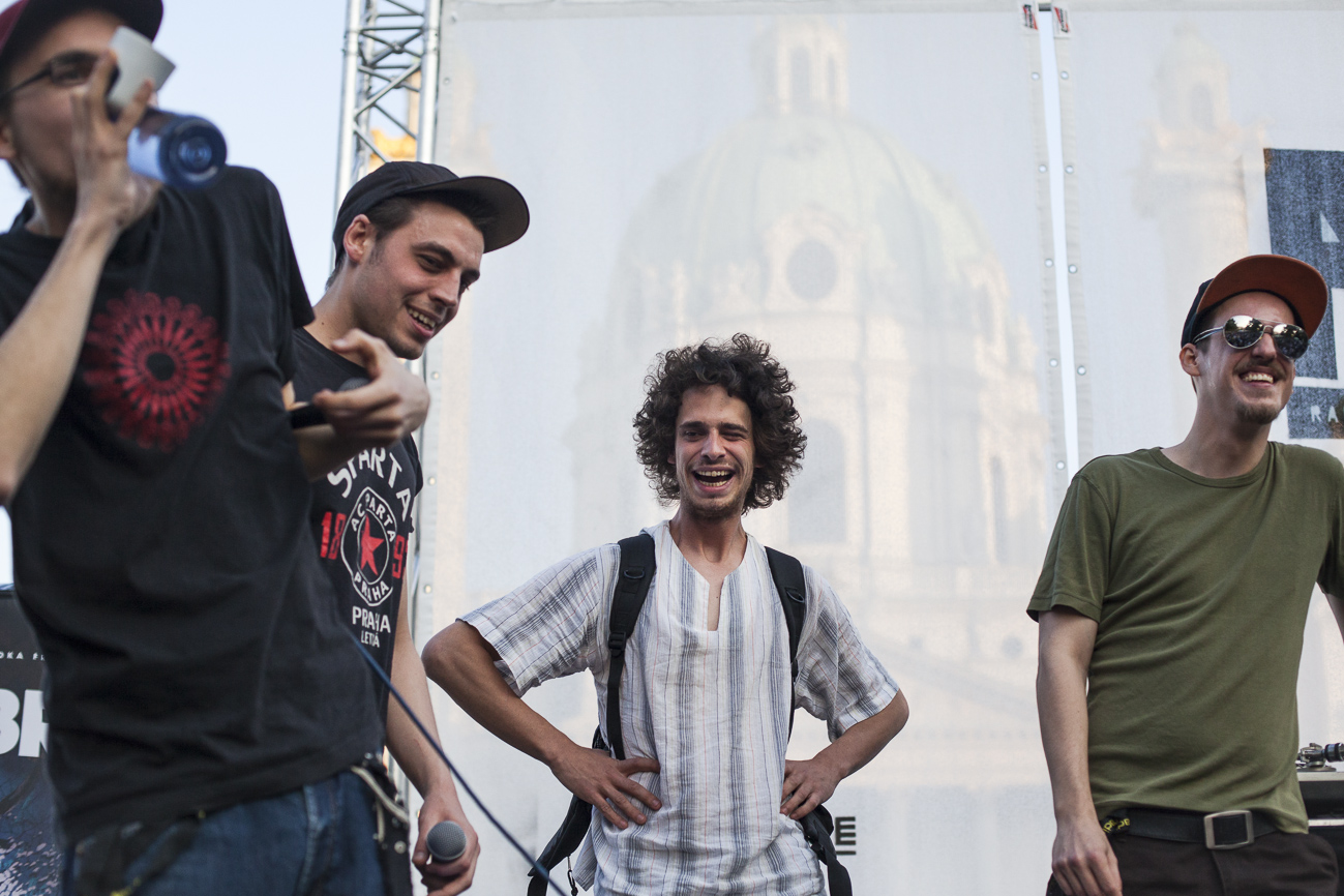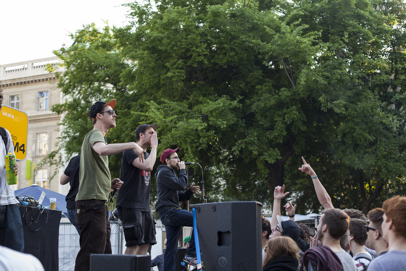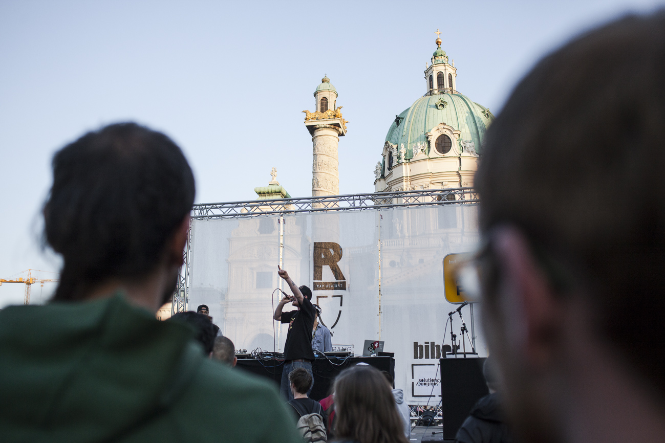 Endlich… Endlich konnten auch die HipHop Heads ihrer Lieblingsmucke bei herrlichem Wetter und traumhafter Kulisse (mit direktem Blick auf die Karlskirche) frönen. Und das alles auch noch für den guten Zweck! So begibt man sich an einem wunderschönen Nachmittag Richtung Karlskirche, mit guter Laune und genug Proviant für den Tag im Rucksack (denn wer Open-Air sagt, muss auch „leiwand-ich-kann-mein-eigenes-bier-und-mein-wurstsemmerl-mitnehmen“ sagen). Programmtechnisch gab es um 14 Uhr (für Überpünktliche) noch nichts zu holen. Aber die Zeit totzuschlagen, fiel mit den Füßen im Brunnen und der Musik aus dem Red Bull Container nicht allzu schwer. Circa um 15 Uhr 30 wurde der erste Input zum Kampf gegen Diskrimierung und Intoleranz gegeben. Es wurden die ersten Interviews mit den RepräsentantInnen der Ute Bock Organisation und SOS Mitmensch geführt. Die Anwesenheitszahl hielt sich zu diesem Zeitpunkt (leider) noch in Grenzen, aber zumindest wurden die verdutzten Passanten und Parkbesucher („Was gibt’s hier?“) über Sinn und Zweck der Veranstaltung aufgeklärt. Im Interview mit TheMessage, erklärte Burstup von Schönheitsfehler, warum Rap – als Genre mit dem wohl größten Wortanteil – wie geschaffen für so eine Veranstaltung sei. Die Interviewrunde mit den restlichen Artists des Konzerts, fiel aufgrund von Zeitdruck leider aus (eine Stellungnahme von ein paar der MCs findet ihr aber in unserem Videobericht). Nachdem klargestellt wurde: „HipHop ist offener geworden und wird nicht weggehen!“, begannen gegen 17 uhr 30 die Live Performances. Den Anfang machte Kash Kane, der nicht nur aufgrund seiner tollpatschigen Eröffnung („It’s All About Hitler…Fuck Hitler“), sondern auch wegen der übersteuernden Anlage, wohl nicht so viel Anklang beim Publikum fand. Es beschlich einen das Gefühl, dass die Anlage heute wohl nicht mehr für Live-Action hergeben würde. Nachdem die VertreterInnen von Organisationen wie Zara, Amnesty International, Biber Magazin etc. noch einmal Sinn und Zweck der Veranstaltung erläuterten, füllte sich der Platz und die Stimmung wurde immer besser… Das bemerkte man schon zu Beginn des nächsten Acts: nämlich Kopf an Kopf ab. Die Jungs rappten zwar nicht zum ersten Mal im Resselpark, „aber zum ersten Mal auf einer Bühne“. Hochpolitisch war das Ganze nicht, dafür doppelt so unterhaltsam. Nach einer chaotischen halben Stunde und ein paar Leckerbissen aus dem Album des Bösen Wolfs aka Nima, räumten die sechs Wiener die Bühne und machten Platz für den Salzburger Local, Demolux. Der hatte T-Ser und Thaiman mit im Gepäck. Die drei lieferten eine sehr coole Show und bewiesen, dass sie eindeutig zu den talentiertesten Rappern im Lande zählen. Auch der ein oder andere Textfehler wurde mit gekonntem Freestyle (fast) kaschiert. Vorallem T-Sers „Austrophobie“ passte super ins Konzept. Doch letztendlich fragte sich der Großteil des Publikums: „Wo war „Müllmänner“? Die nächsten Acts, nämlich Migzebonez und die Duzz Down San Allstars heizten dem mittlerweile gesteckt vollem Karlsplatz ordentlich ein. Die RA Hymne, „Grüß Gott“ von P-tah wurde präsentiert und damit der Fokus wieder daraufgelegt, warum sich überhaupt so viele Mensch im Zentrum Wiens zusammenfanden. Nach einem kurzen Auftritt des Prostesongcontest Gewinners „Fight Rap Camp“ betrat der letzte Act des Abends die Bühne: Yasmo. Mit viel Humor und guter Laune brachte sie die Botschaft des Abends perfekt rüber. Thematisch ein ideales Booking für so ein Event. Auch die Crowd hatte sichtlich Spaß und selbst Yasmo, die ihre Mutter zum Konzert mitgebracht hatte, schien stellenweise überrascht vom Engagement des Publikums. Gekonnt schlüpfte sie für ein paar Tracks in die Rolle der Miss Lead und beendete ihr Set schlussendlich mit dem Titeltrack ihres letzten Albums: Kein Platz für Zweifel. In der Tat blieb nach den abschließenden Tracks von DJ Bacchus kein Platz mehr für Zweifel, dass die Veranstaltung ein voller Erfolg war. Ein guter Tag gegen Rechts, Intoleranz, Diskriminierung und für HipHop in Österreich!
