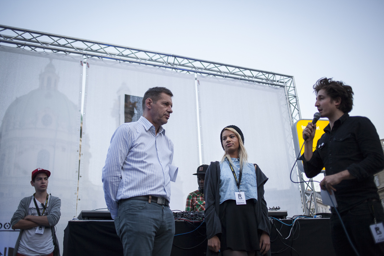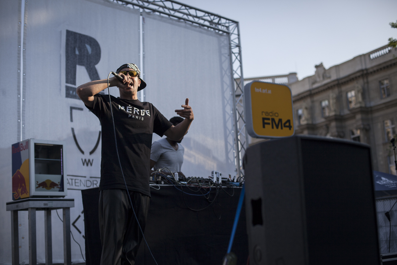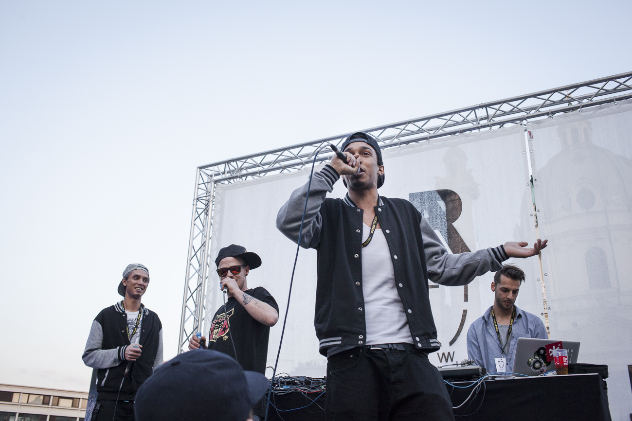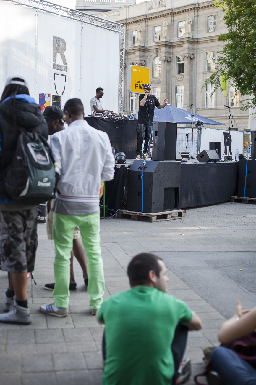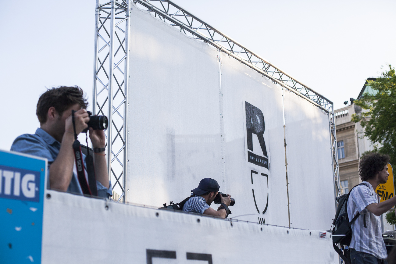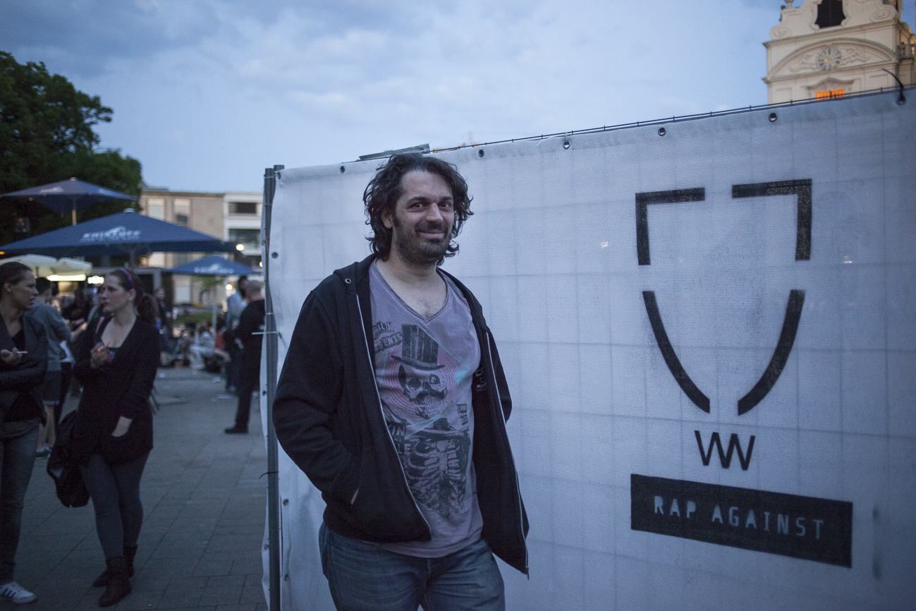 Endlich… Endlich konnten auch die HipHop Heads ihrer Lieblingsmucke bei herrlichem Wetter und traumhafter Kulisse (mit direktem Blick auf die Karlskirche) frönen. Und das alles auch noch für den guten Zweck! So begibt man sich an einem wunderschönen Nachmittag Richtung Karlskirche, mit guter Laune und genug Proviant für den Tag im Rucksack (denn wer Open-Air sagt, muss auch „leiwand-ich-kann-mein-eigenes-bier-und-mein-wurstsemmerl-mitnehmen“ sagen). Programmtechnisch gab es um 14 Uhr (für Überpünktliche) noch nichts zu holen. Aber die Zeit totzuschlagen, fiel mit den Füßen im Brunnen und der Musik aus dem Red Bull Container nicht allzu schwer. Circa um 15 Uhr 30 wurde der erste Input zum Kampf gegen Diskrimierung und Intoleranz gegeben. Es wurden die ersten Interviews mit den RepräsentantInnen der Ute Bock Organisation und SOS Mitmensch geführt. Die Anwesenheitszahl hielt sich zu diesem Zeitpunkt (leider) noch in Grenzen, aber zumindest wurden die verdutzten Passanten und Parkbesucher („Was gibt’s hier?“) über Sinn und Zweck der Veranstaltung aufgeklärt. Im Interview mit TheMessage, erklärte Burstup von Schönheitsfehler, warum Rap – als Genre mit dem wohl größten Wortanteil – wie geschaffen für so eine Veranstaltung sei. Die Interviewrunde mit den restlichen Artists des Konzerts, fiel aufgrund von Zeitdruck leider aus (eine Stellungnahme von ein paar der MCs findet ihr aber in unserem Videobericht). Nachdem klargestellt wurde: „HipHop ist offener geworden und wird nicht weggehen!“, begannen gegen 17 uhr 30 die Live Performances. Den Anfang machte Kash Kane, der nicht nur aufgrund seiner tollpatschigen Eröffnung („It’s All About Hitler…Fuck Hitler“), sondern auch wegen der übersteuernden Anlage, wohl nicht so viel Anklang beim Publikum fand. Es beschlich einen das Gefühl, dass die Anlage heute wohl nicht mehr für Live-Action hergeben würde. Nachdem die VertreterInnen von Organisationen wie Zara, Amnesty International, Biber Magazin etc. noch einmal Sinn und Zweck der Veranstaltung erläuterten, füllte sich der Platz und die Stimmung wurde immer besser… Das bemerkte man schon zu Beginn des nächsten Acts: nämlich Kopf an Kopf ab. Die Jungs rappten zwar nicht zum ersten Mal im Resselpark, „aber zum ersten Mal auf einer Bühne“. Hochpolitisch war das Ganze nicht, dafür doppelt so unterhaltsam. Nach einer chaotischen halben Stunde und ein paar Leckerbissen aus dem Album des Bösen Wolfs aka Nima, räumten die sechs Wiener die Bühne und machten Platz für den Salzburger Local, Demolux. Der hatte T-Ser und Thaiman mit im Gepäck. Die drei lieferten eine sehr coole Show und bewiesen, dass sie eindeutig zu den talentiertesten Rappern im Lande zählen. Auch der ein oder andere Textfehler wurde mit gekonntem Freestyle (fast) kaschiert. Vorallem T-Sers „Austrophobie“ passte super ins Konzept. Doch letztendlich fragte sich der Großteil des Publikums: „Wo war „Müllmänner“? Die nächsten Acts, nämlich Migzebonez und die Duzz Down San Allstars heizten dem mittlerweile gesteckt vollem Karlsplatz ordentlich ein. Die RA Hymne, „Grüß Gott“ von P-tah wurde präsentiert und damit der Fokus wieder daraufgelegt, warum sich überhaupt so viele Mensch im Zentrum Wiens zusammenfanden. Nach einem kurzen Auftritt des Prostesongcontest Gewinners „Fight Rap Camp“ betrat der letzte Act des Abends die Bühne: Yasmo. Mit viel Humor und guter Laune brachte sie die Botschaft des Abends perfekt rüber. Thematisch ein ideales Booking für so ein Event. Auch die Crowd hatte sichtlich Spaß und selbst Yasmo, die ihre Mutter zum Konzert mitgebracht hatte, schien stellenweise überrascht vom Engagement des Publikums. Gekonnt schlüpfte sie für ein paar Tracks in die Rolle der Miss Lead und beendete ihr Set schlussendlich mit dem Titeltrack ihres letzten Albums: Kein Platz für Zweifel. In der Tat blieb nach den abschließenden Tracks von DJ Bacchus kein Platz mehr für Zweifel, dass die Veranstaltung ein voller Erfolg war. Ein guter Tag gegen Rechts, Intoleranz, Diskriminierung und für HipHop in Österreich!