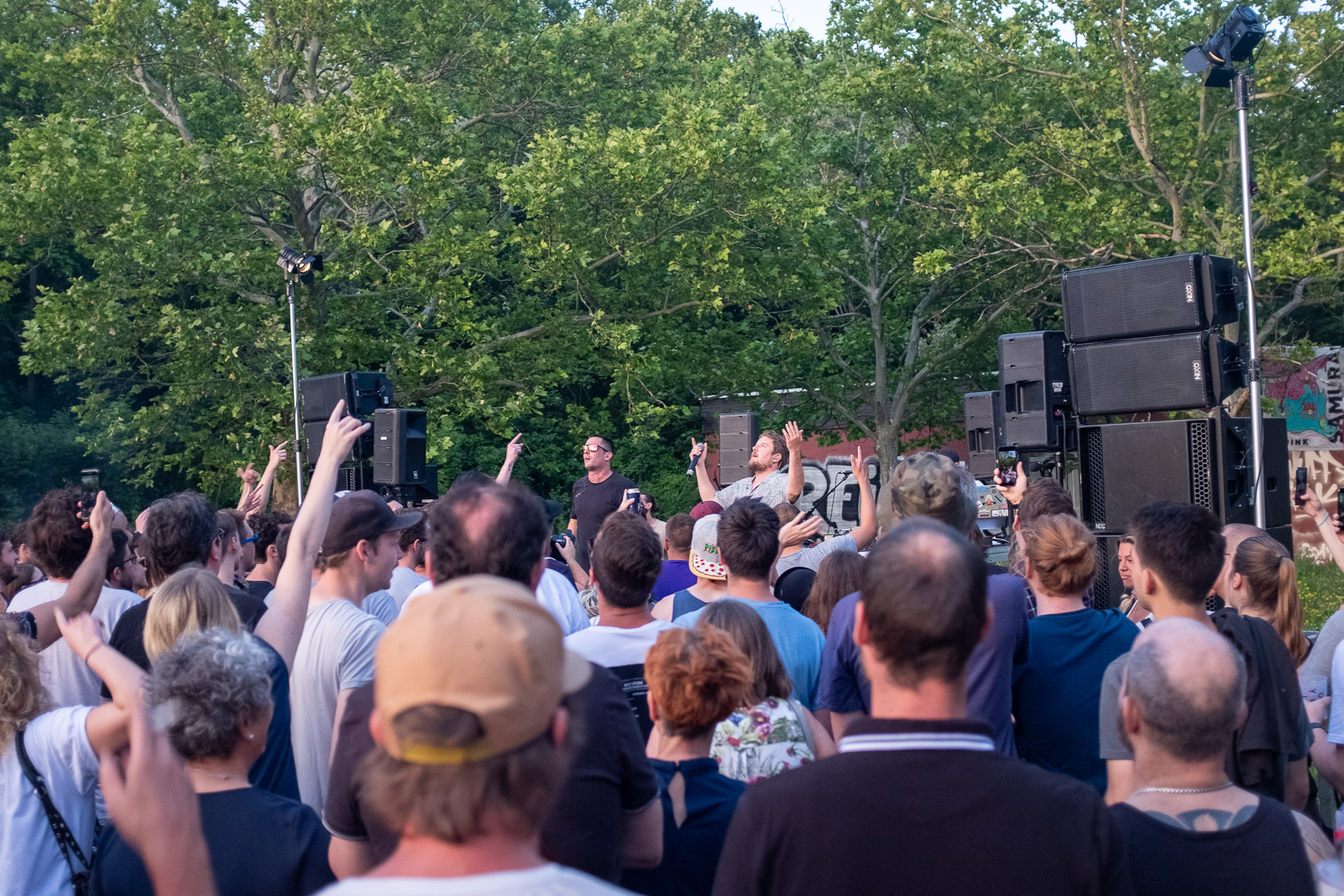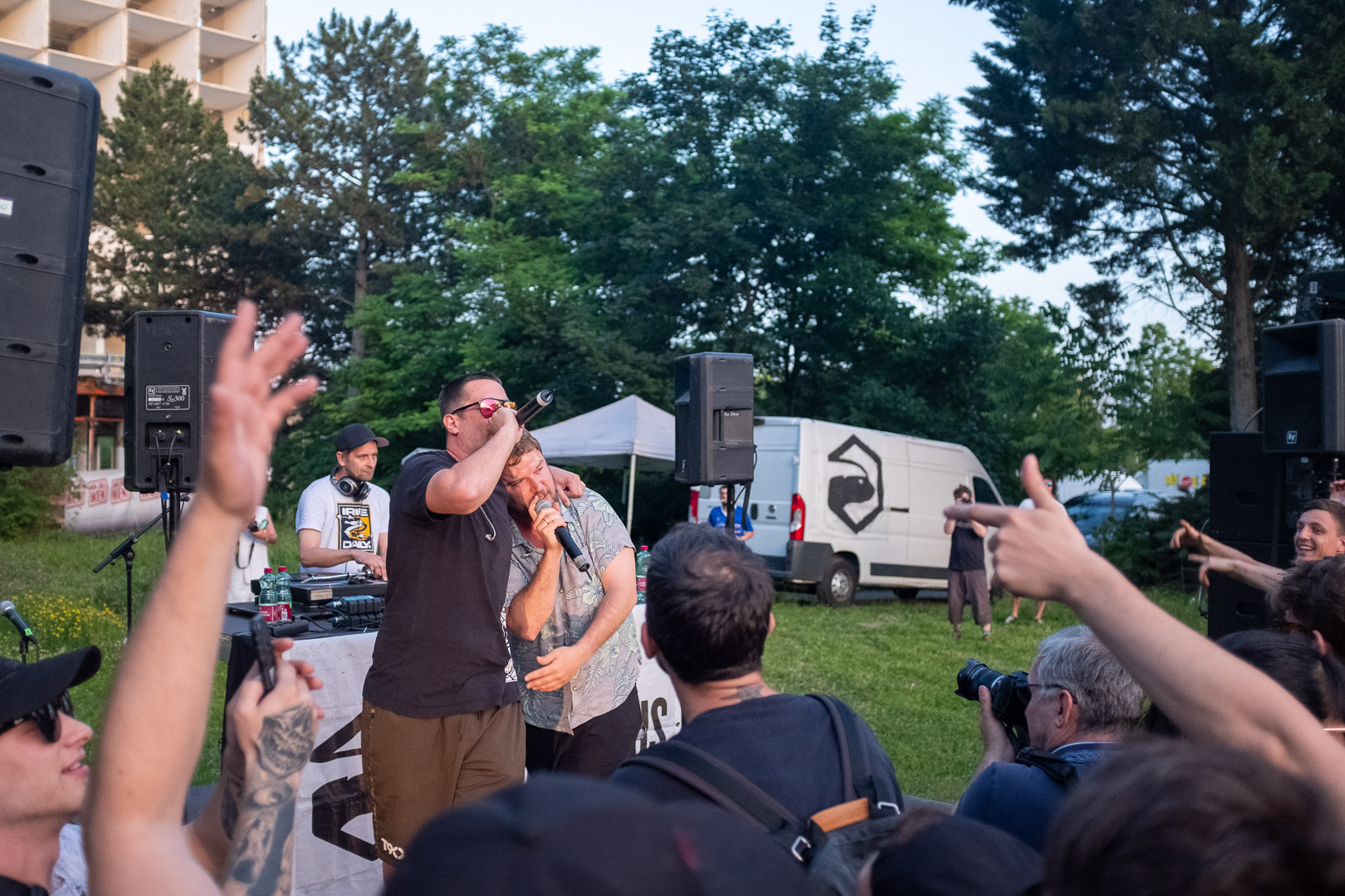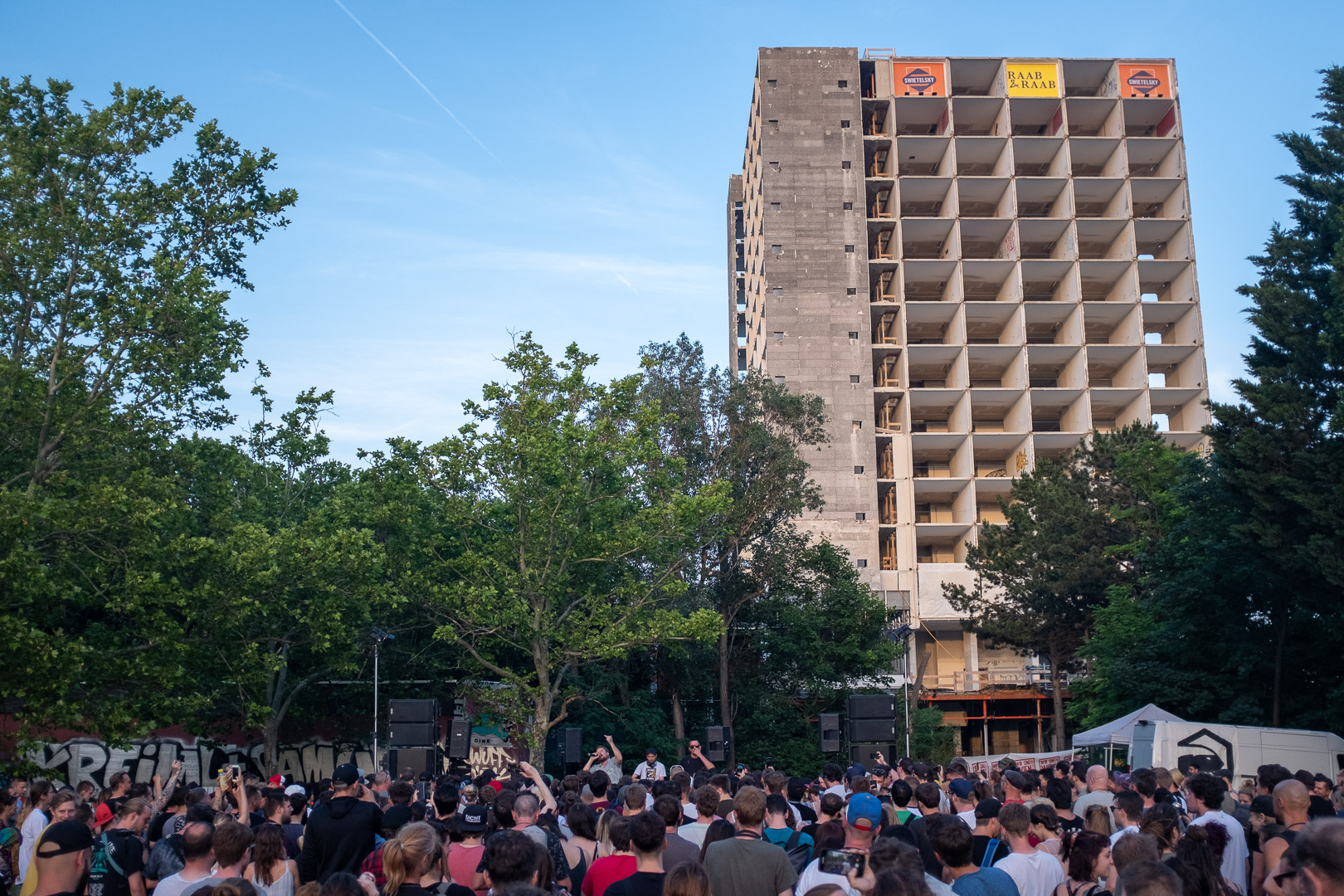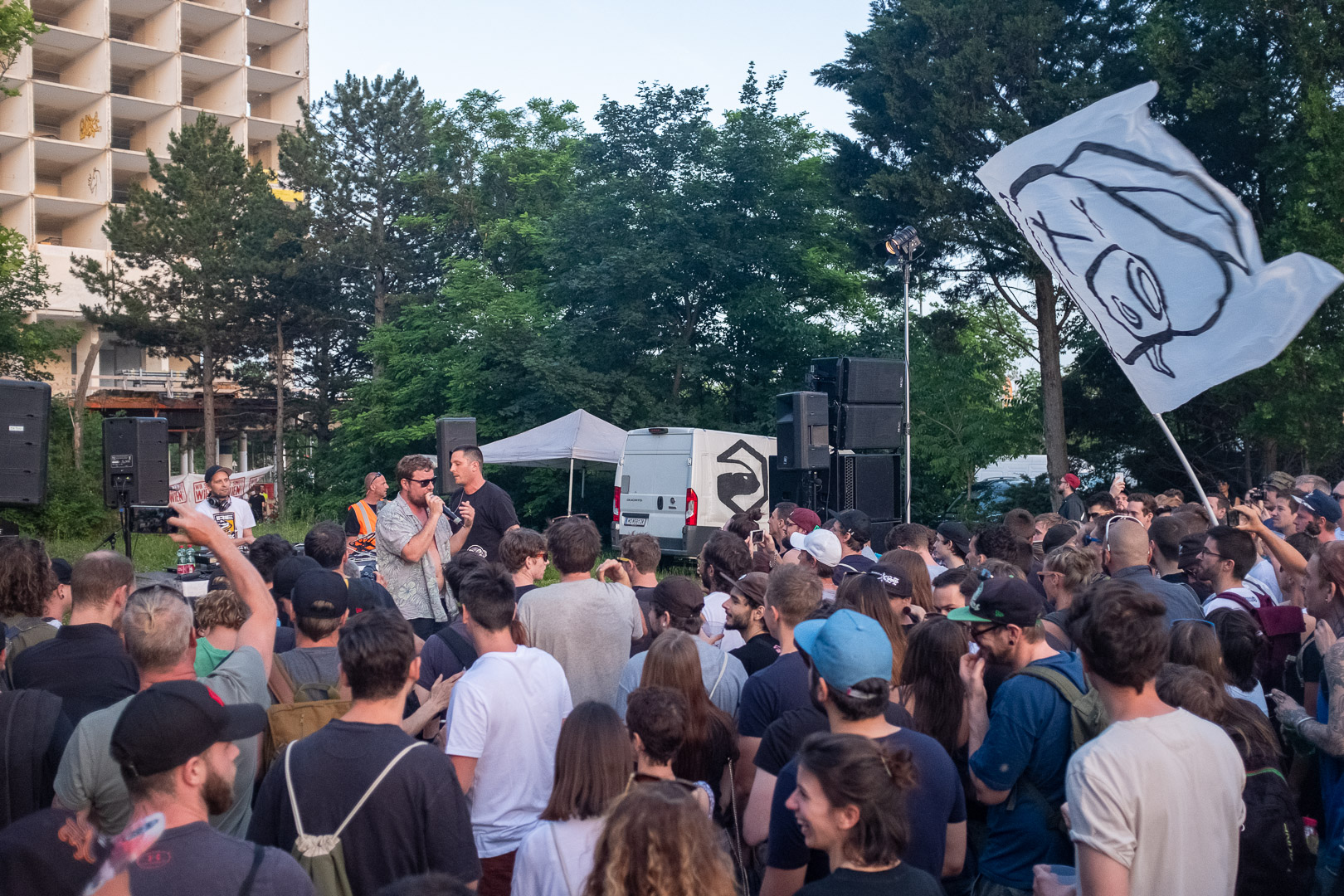 Stell dir vor, eine Wiener Gstättn, dazu jede Menge motivierte Menschen, die wegen der schönsten Männer Wiens gekommen sind. Oder dem Schweinehund, auch bekannt als Kreiml & Samurai. So ganz genau weiß man das oft nicht. Auf jeden Fall nach Favoriten. Bei brütender Hitze. Aber bei freiem Eintritt. Win-win, wie der Wiener so schön sagt.