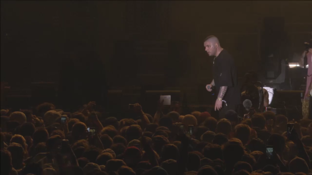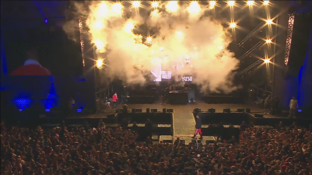 Zumindest im Vorfeld zeigte sich Fler „ready“ für diese ehrenhafte Aufgabe, sollen schließlich ganze 80.000 Euro in den Gig investiert worden sein. Vor so viel Einsatz kann man schon den Hut ziehen, die großen Ankündigungen erhöhen natürlich die Spannung auf den Auftritt. Diesen beginnen Fler und „Epic“-Kollabo-Partner Jalil nach einer charmanten Anmoderation durch hiphop.de-Reporter Rooz mit der passenden Statement-Nummer „Vibe“. Schnell zeigt sich, wofür das meiste Geld in die Schweiz überwiesen wurde, umrahmt heftige Pyrotechnik die beiden Rapper und den DJ. Zwar nicht ganz so eindrucksvoll wie bei Flers Homie und Rammstein-Frontmann Till Lindemann, aber für HipHop-Verhältnisse definitiv in Ordnung. Bei so viel visueller Action könnte man aber fast vergessen, dass die Musik doch im Vordergrund stehen soll. Leider krankt es daran, ganz egal ob man nun den „Vibe“ fühlt oder nicht. Flers Mikrofon ist viel zu leise, folgerichtig muss er wie ein Sänger einer Hardcore-Punk-Band brüllen, um überhaupt verstanden zu werden. Sein Bühnenpartner machte vor wenigen Wochen beim Auftritt bei Jan Böhmermann eine ähnliche Erfahrung. Die Ton-Probleme werden im Folgenden nicht besser, Fler nur schneller heiser, das Playback im Hintergrund avanciert zum Rettungsanker.